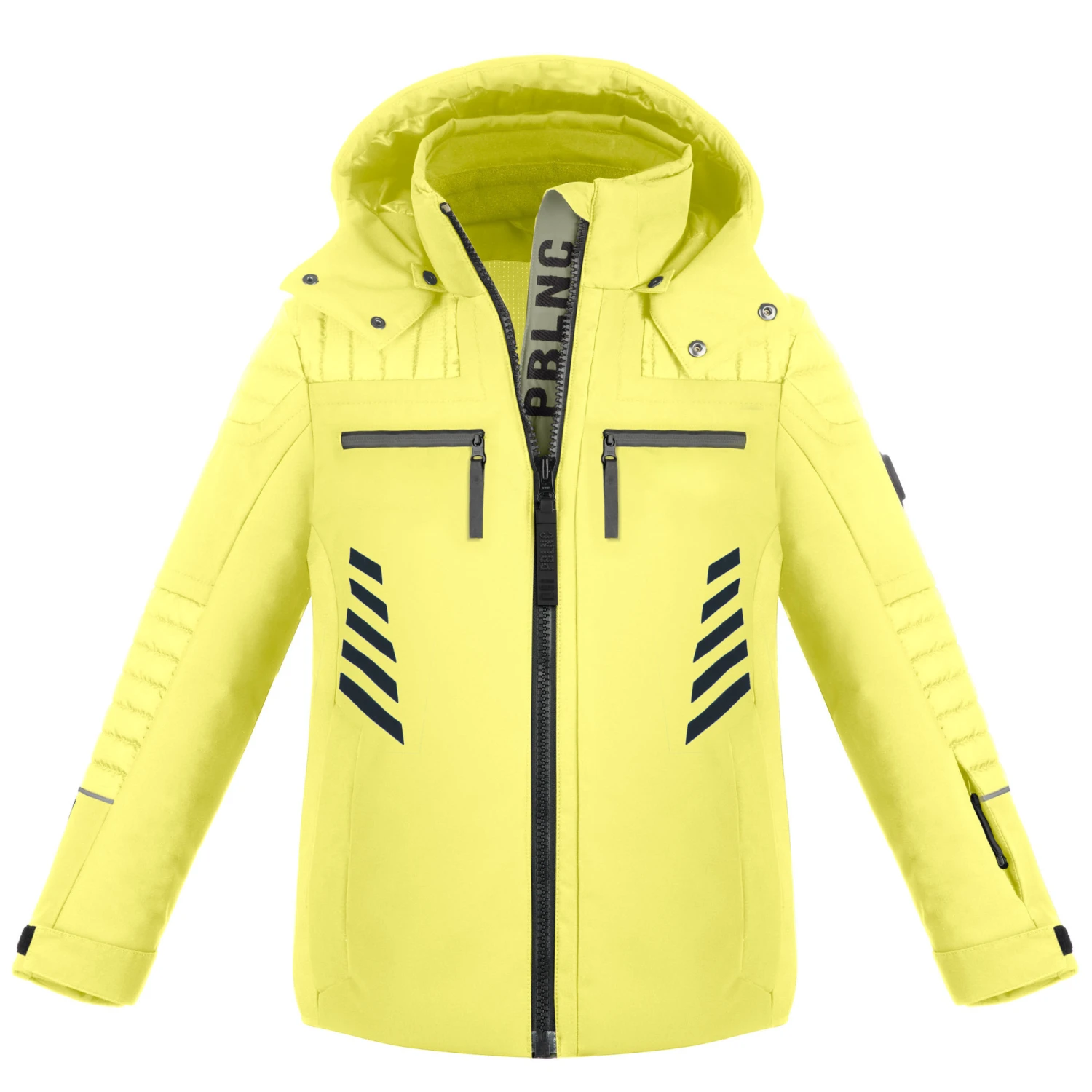– Manches articulées, poignets réglables par Velcro, capuche amovible et réglable à visière, col large montant, fermeture éclair à l’avant avec nouvelle glissière logo, poches poitrine et latérales zippées, poche zippée pour forfait de ski sur la manche gauche, poche intérieure zippée
